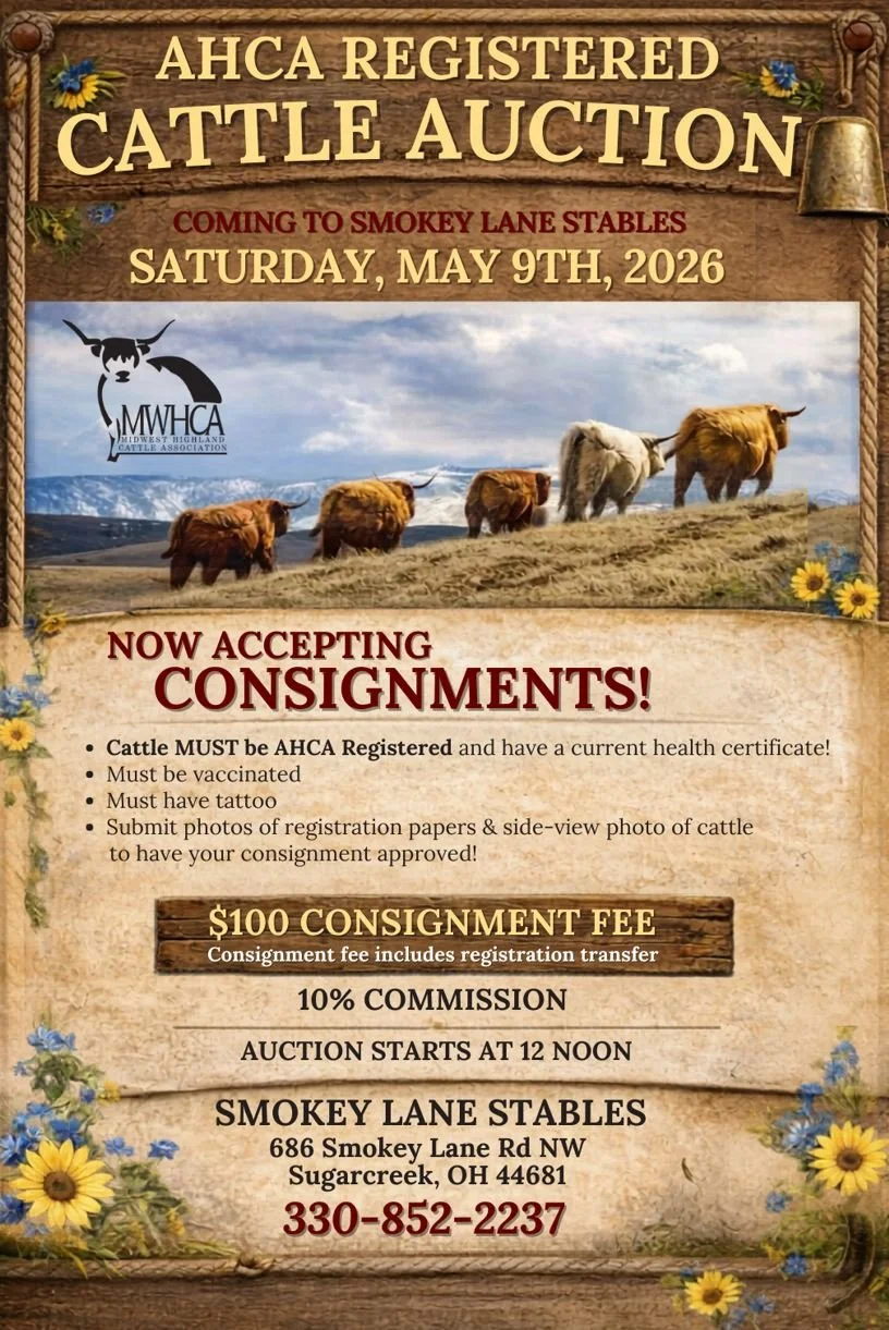 You spoke and we listened - excited to partner with Smokey Lane Stables to bring a AHCA registered Highland auction to Sugarcreek, Ohio. If you are not interested in selling or in the market to buy, this event will be a great time to network both Friday night and Saturday with other members and Highland enthusiasts.