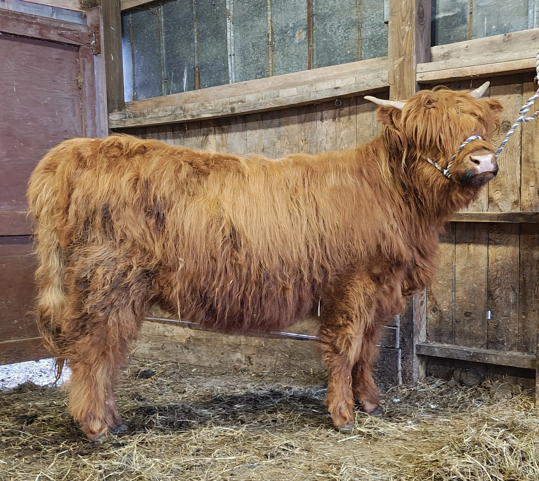 Risti is a hairy red 10-month-old heifer and halter broke. Her sire is Snowland Levi (D)#66166 a light red easy personality bull and dam is Snowland VT Sue #54718 a red 10-year-old shy cow. Risit’s vaccinations include Triple A -HB, Brucellosis Calfhood Vaccination, BVD test and Ivermectin Dewormer. Risti weighed 556# on 3/27/26. Her pedigrees include Trafalgar Luther, Twinflower, EZ Acres, Summit Ranch and Snowland First Lady and Snowland Peter. Risti has been friendly.