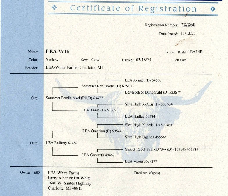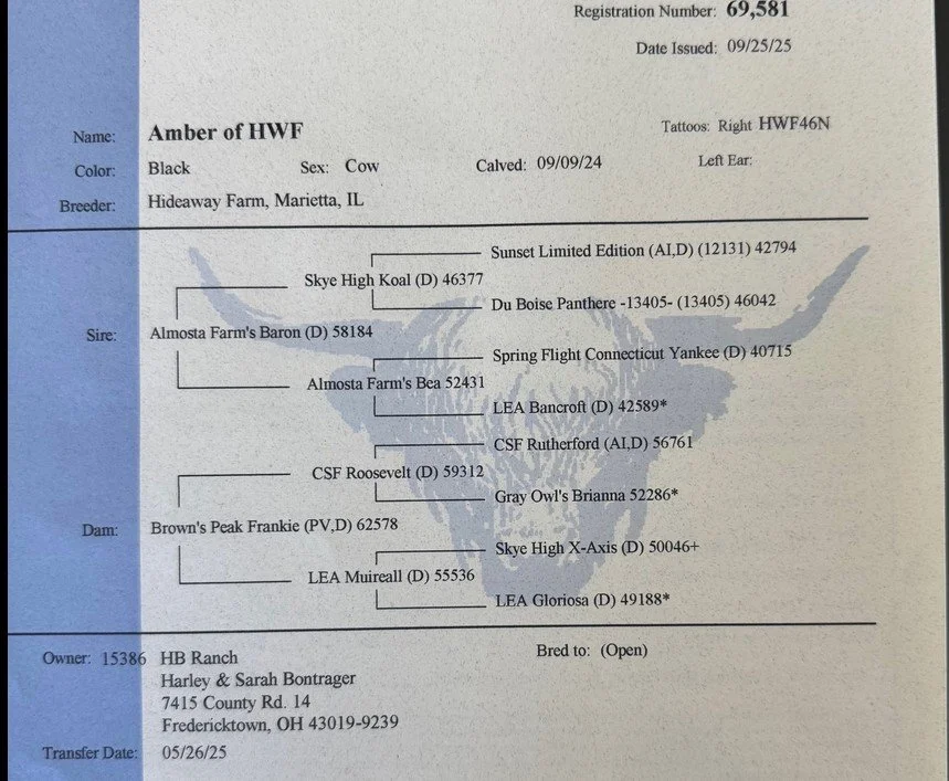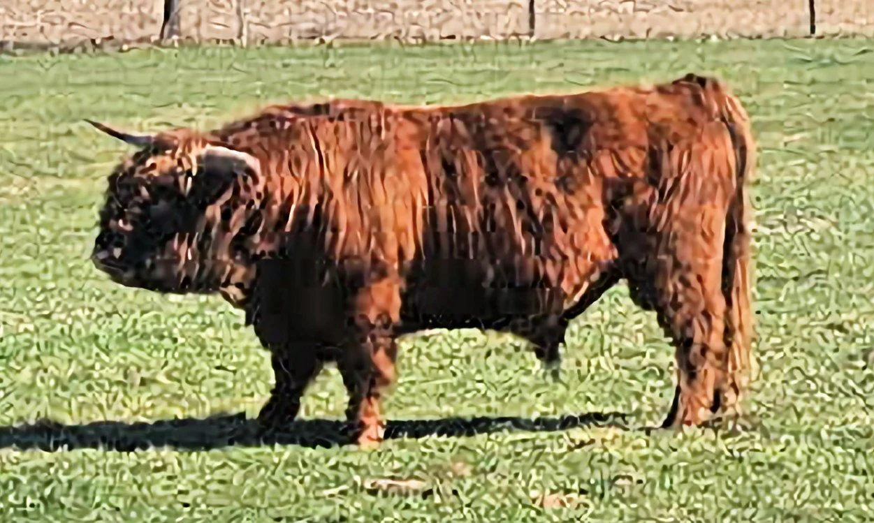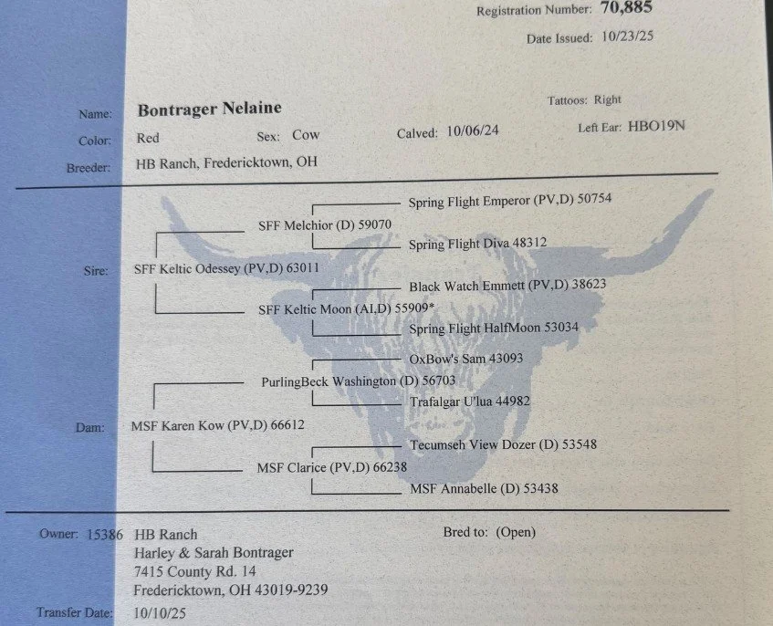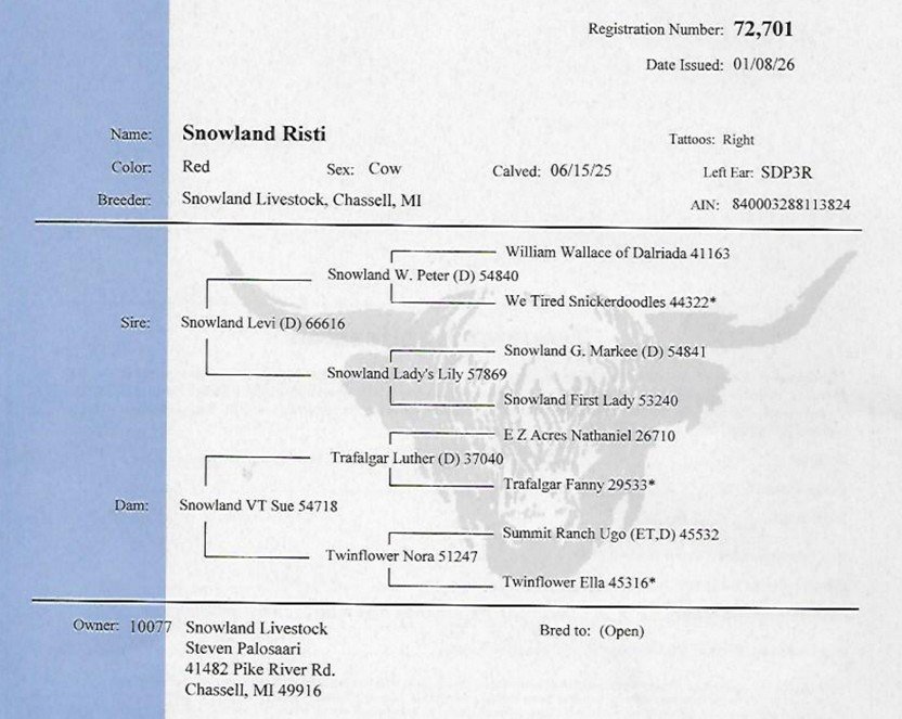 Riikka is a 11-month-old red heifer. Her sire is Trafalgar James (D) #61370 a large frame red bull and her dam is Snowland W. Terry #53721, a successful milk producing 12-year-old red cow. Riikka’s vaccinations include Triple A HB, Brucellosis Calfhood Vaccination, BVD test and Ivermectin Dewormer. Riikka weighed 632# on 3/27/26. Her pedigrees include William Wallace of Dalriada, a national ranked RC Bull, Schon Boden, T2, We Tired and the national recognized Trafalgar genetics. Riikka has the potential to produce quality Highland cattle.