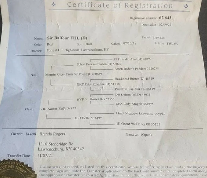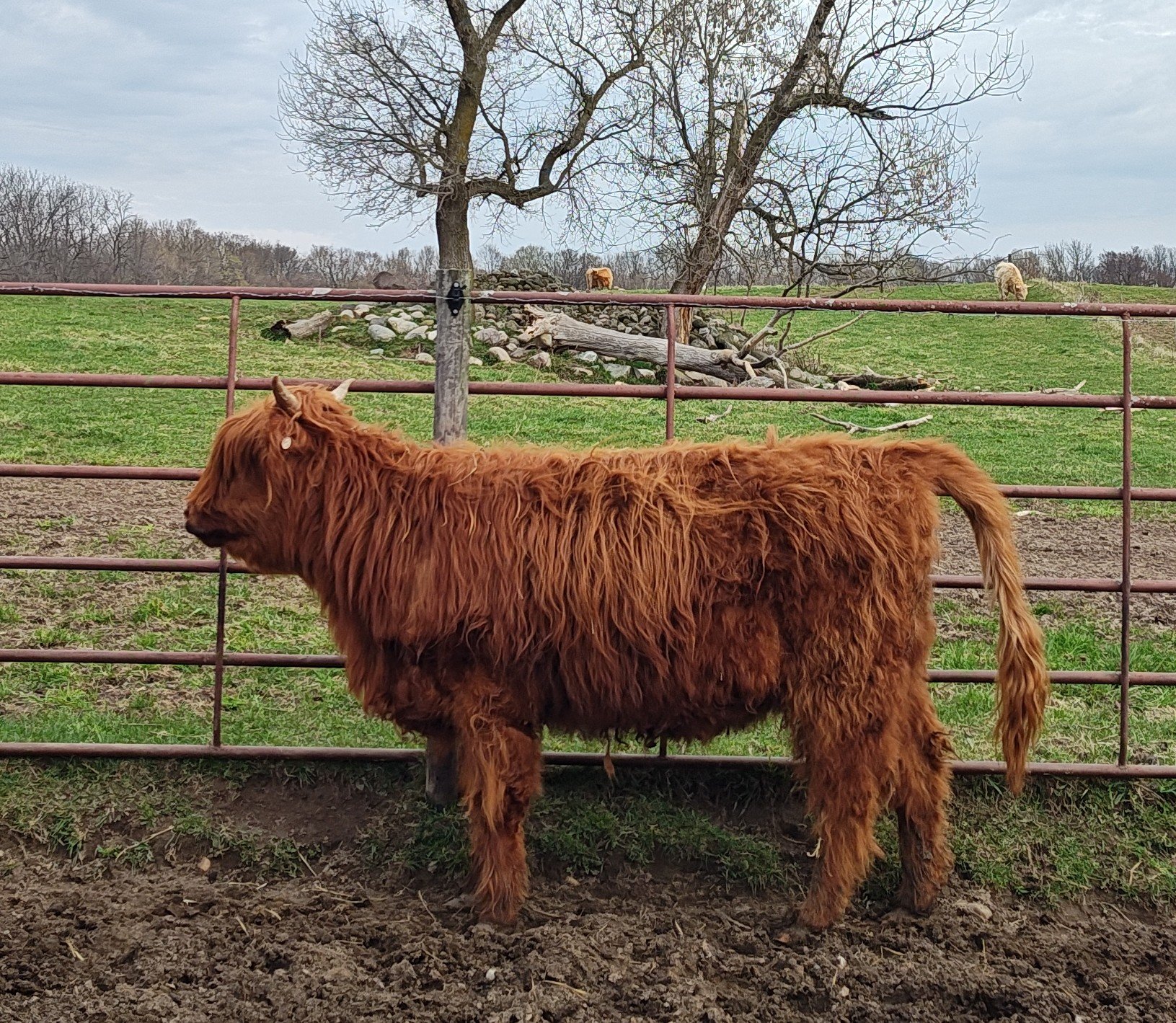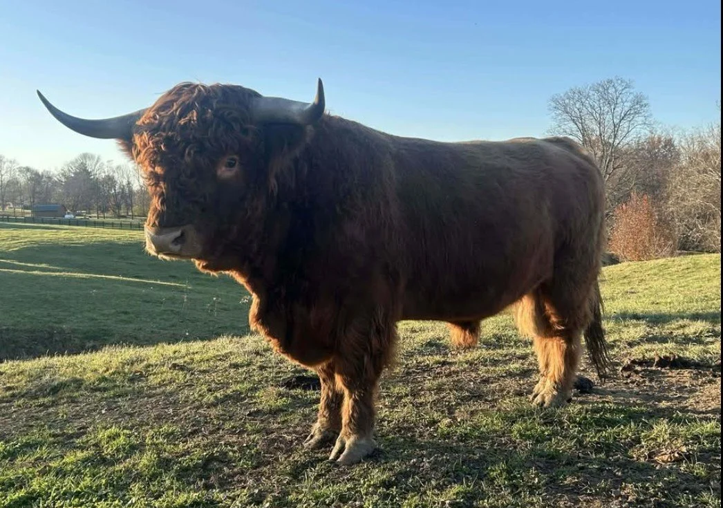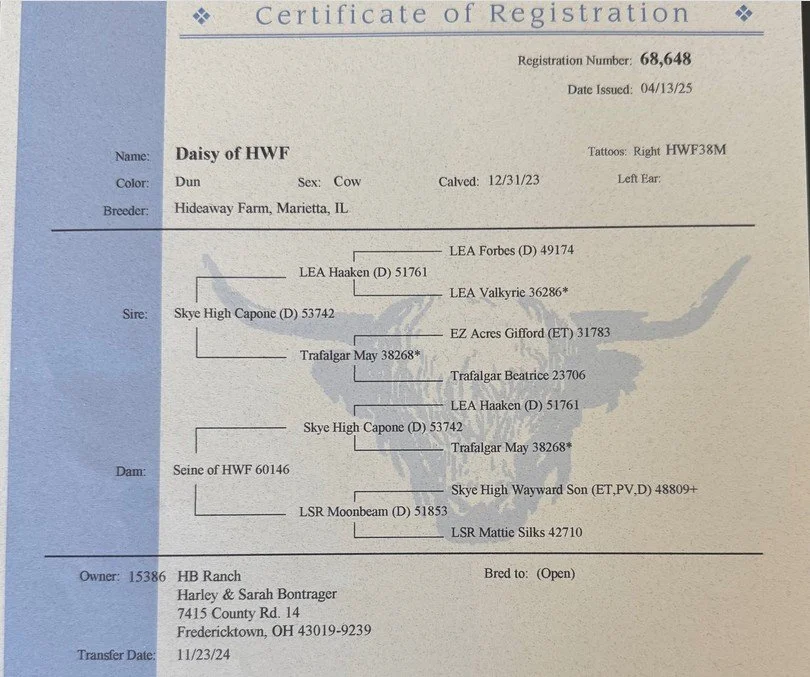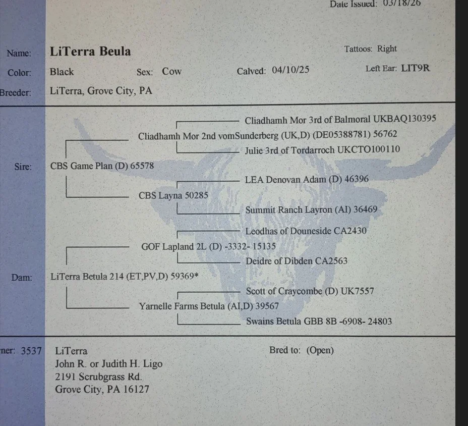 Riikka is a 11-month-old red heifer. Her sire is Trafalgar James (D) #61370 a large frame red bull and her dam is Snowland W. Terry #53721, a successful milk producing 12-year-old red cow. Riikka’s vaccinations include Triple A HB, Brucellosis Calfhood Vaccination, BVD test and Ivermectin Dewormer. Riikka weighed 632# on 3/27/26. Her pedigrees include William Wallace of Dalriada, a national ranked RC Bull, Schon Boden, T2, We Tired and the national recognized Trafalgar genetics. Riikka has the potential to produce quality Highland cattle.