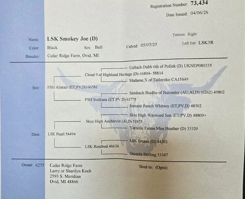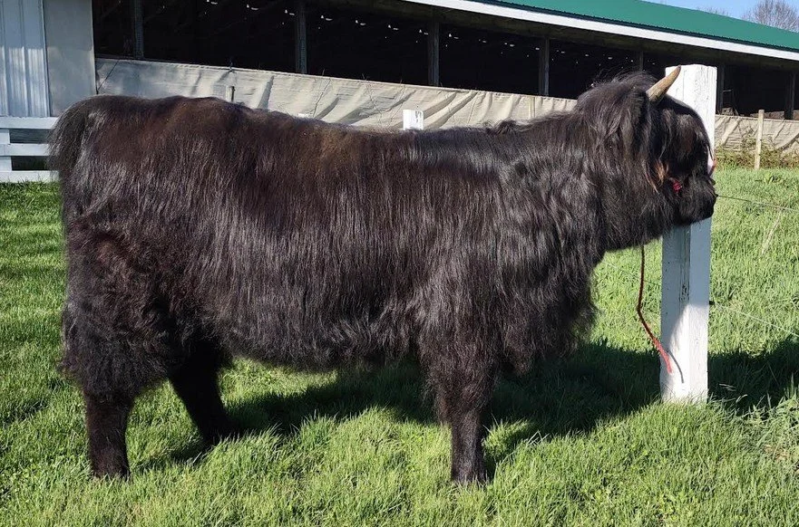 Smokey Joe is a gentle 12 month old bull. He will be broke to lead by sale date. His structure and growth are first rate. His pedigree is, likewise, outstanding. His genetics include the well-known breeding of Skye High Farms, Four Starr Highlands, and Osceola Highlands among others.. In short, Smokey Joe is a beautiful black bull with long hair and a pleasing personality.